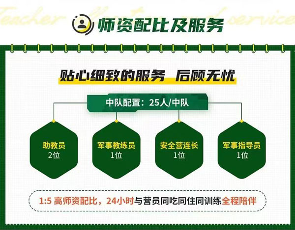 师资配比:1:5左右,中队配置25人/中队:助教员2位、军事教练员1位、安全营连长1位、军事指导员1位