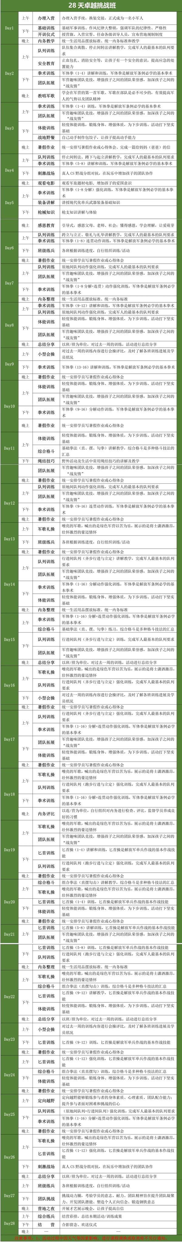 1、营地提供物品:军装两套,军帽1顶,水壶1个,提供床上用品(枕头、棉被、席子),脸盆,宿舍有空调