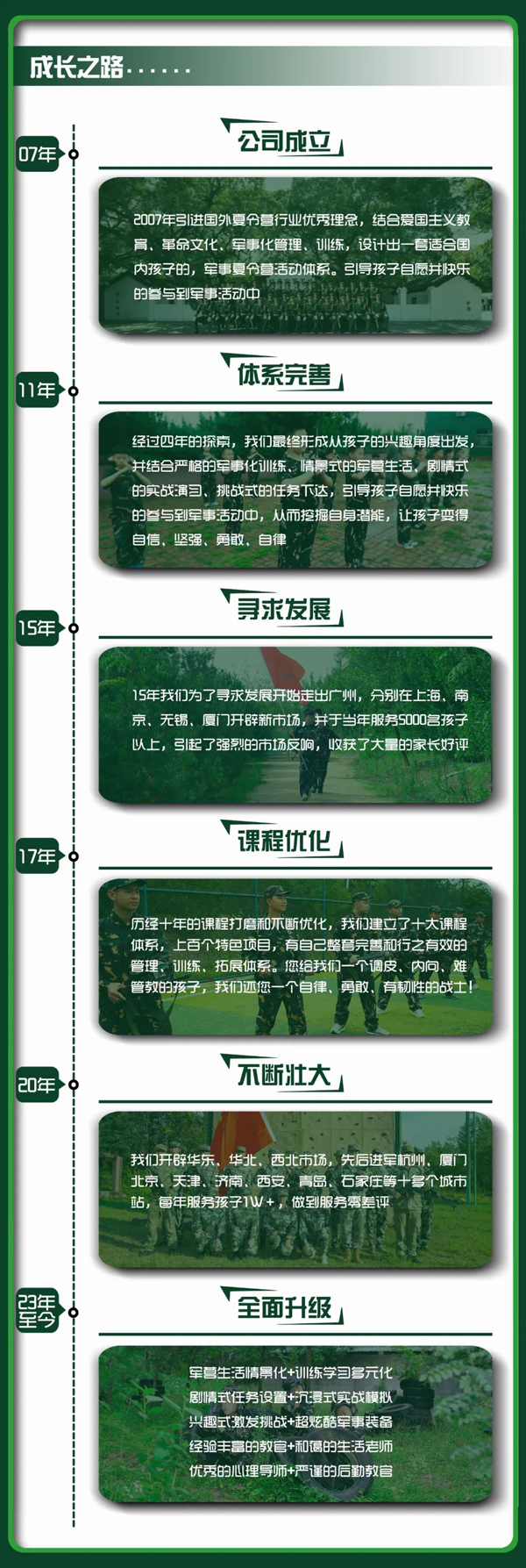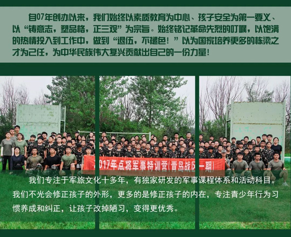 我们是模仿部队模式建立还原部队风貌,让孩子情景式体验军旅生活,沉浸式体验实战演习,剧情式完成每日任务。最大化提升孩子的训练效果。
