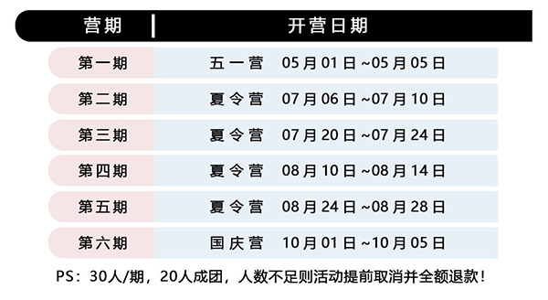 3、若营员有特殊情况需在入营前及时告知领队老师(作业打卡、用药说明、饮食禁忌、过敏源等);